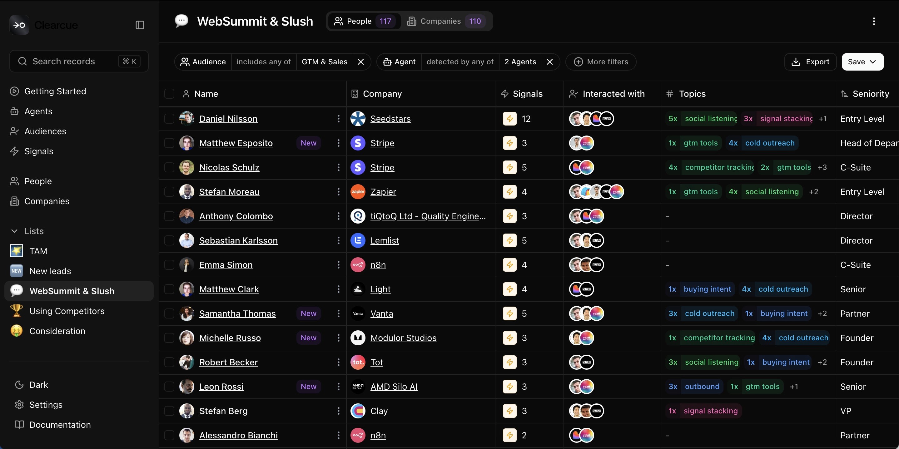 The best part? Event signals don’t sit in isolation. They merge with your other Clearcue agents—competitors, influencers, mentions—so you see a complete picture of intent.