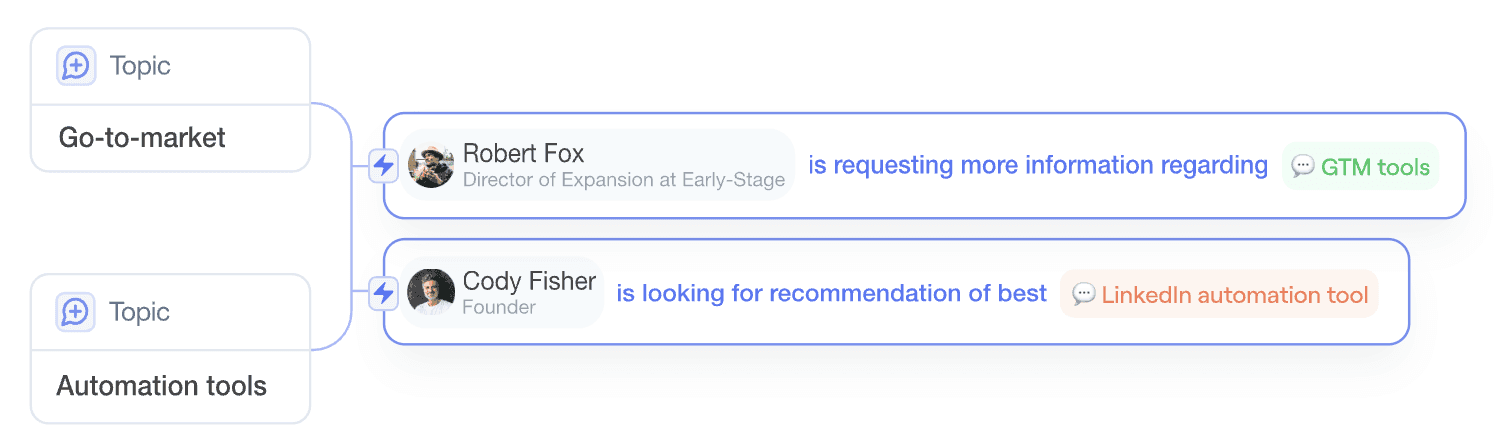 Each post is automatically enriched with topics, intent, and lead profiles so you can spot rising interest without digging through feeds.